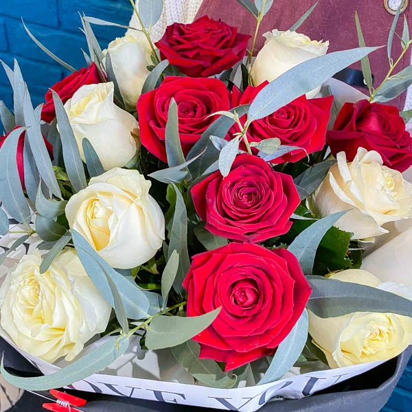 15 роз: роза красная, белая - 15 шт., эвкалипт - 4 шт., упаковка, бант