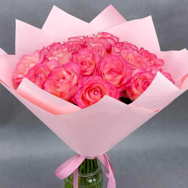роза розовая - 25 шт., упаковка, лента. Оттенок роз может отличаться от представленного на фото